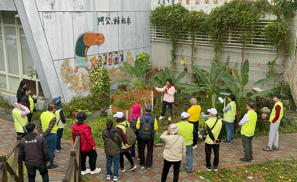 碧雲莊社區發展協會執行長劉洪黎吟分享,該社區堆動的「阿公,站起來生態菜園」,展現長輩社會參與實踐尊嚴老化與共融照顧的成果,並示範雨撲滿雨水回收再利用作法,呈現資源循環與低碳生活的具體落實。