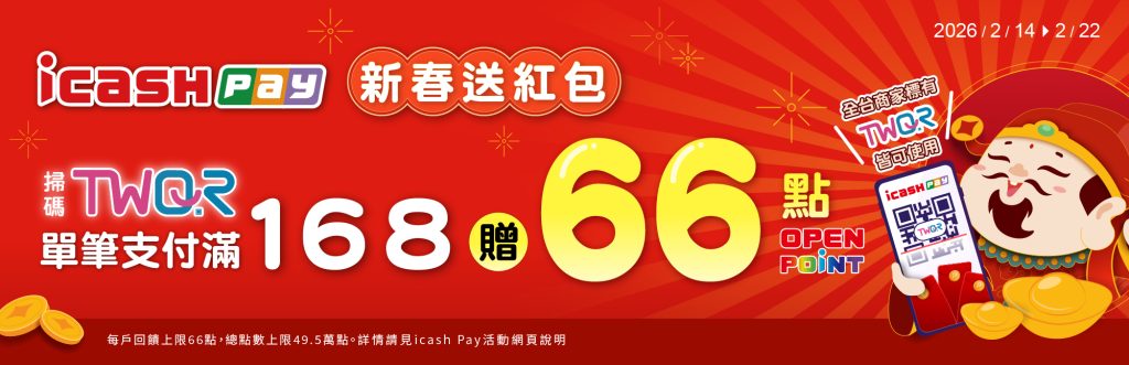 迎接馬年讓民眾馬上有錢,icash Pay推出TWQR新春送紅包活動,馬年就要66大順,自2月14日起至2月22日,只要民眾於全台看到標示TWQR的店家,用icash Pay掃描QR Code付款,單筆消費滿168元,即可獲得66點OPENPOINT點數回饋,每戶限回饋乙次,讓民眾在返鄉或走春期間,都能輕鬆掃碼支付,把新春紅包直接存進OPENPOINT點數帳戶。