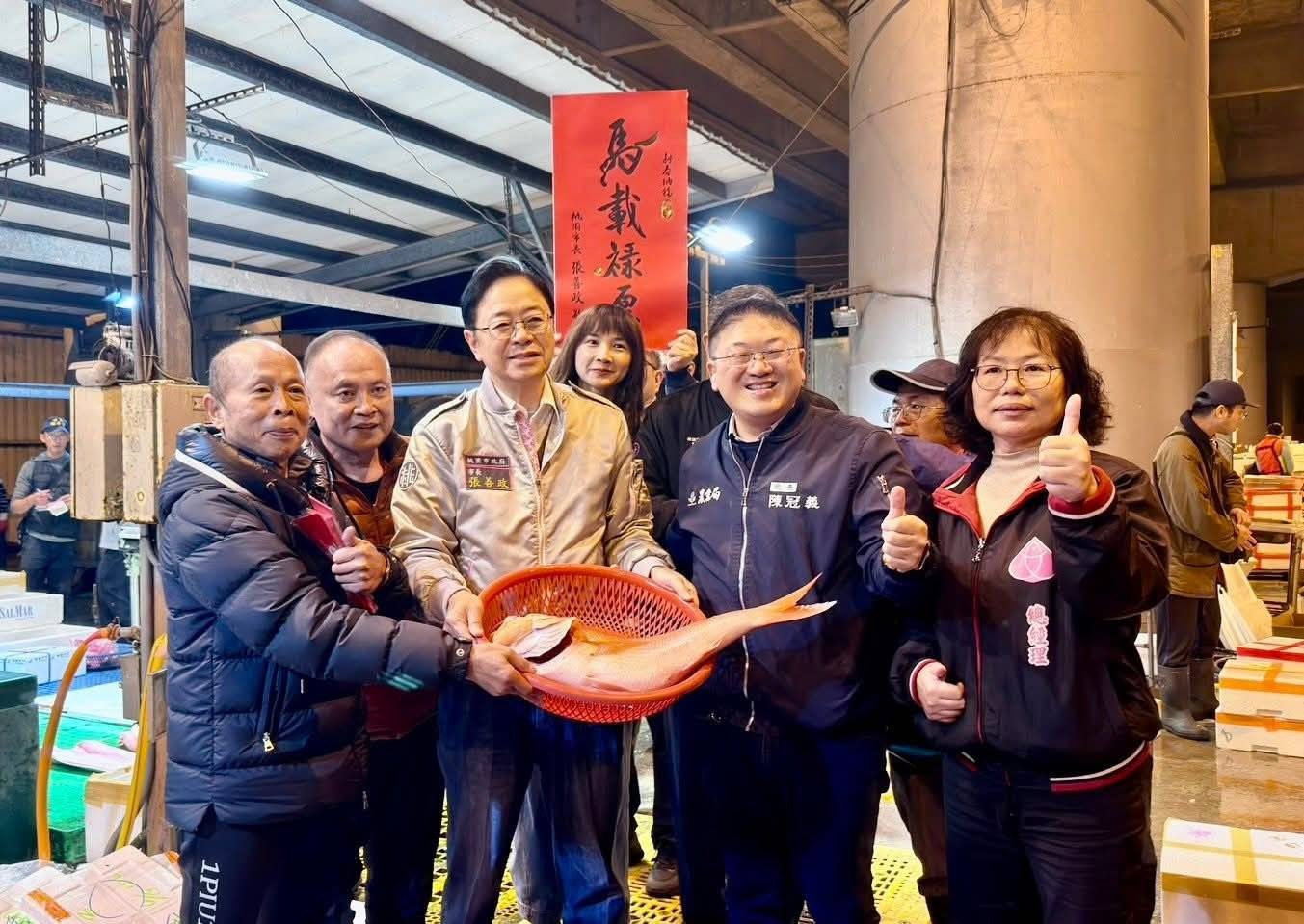 桃園市長張善政今(10)日清晨分別前往桃園魚市場及果菜市場,視察年前魚貨、果菜供應情形,現場並發放福袋向所有辛苦的工作人員拜早年。張善政表示,農曆春節將近,魚市場及果菜市場出貨量明顯增加,感謝所有工作人員,每天堅守崗位為桃園的市民朋友提供最新鮮的魚貨及蔬果。