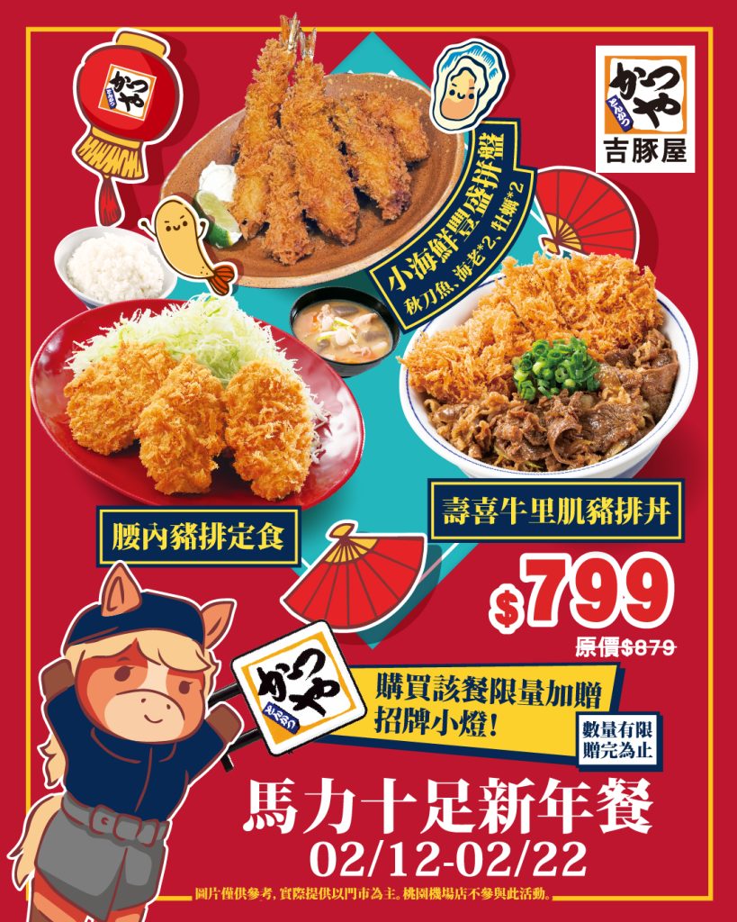 歡慶新年到來,《台灣吉豚屋》推出應景的「馬力十足新年餐」,集結品牌招牌人氣主餐與澎湃拼盤,點一套就能輕鬆享受豐盛又滿足的年節美味。「馬力十足新年餐」精選兩款主餐——「壽喜牛里肌豬排丼」與「腰內豬排定食」,並搭配由秋刀魚、牡蠣及海老組成的「小海鮮豐盛拼盤」,一次滿足海陸雙重享受,為新年餐桌增添奢華亮點。餐點超值組合價只要799元,02月12起至2月22日,限時十天,凡購買還加贈「招牌小燈」,數量有限,贈完為止。