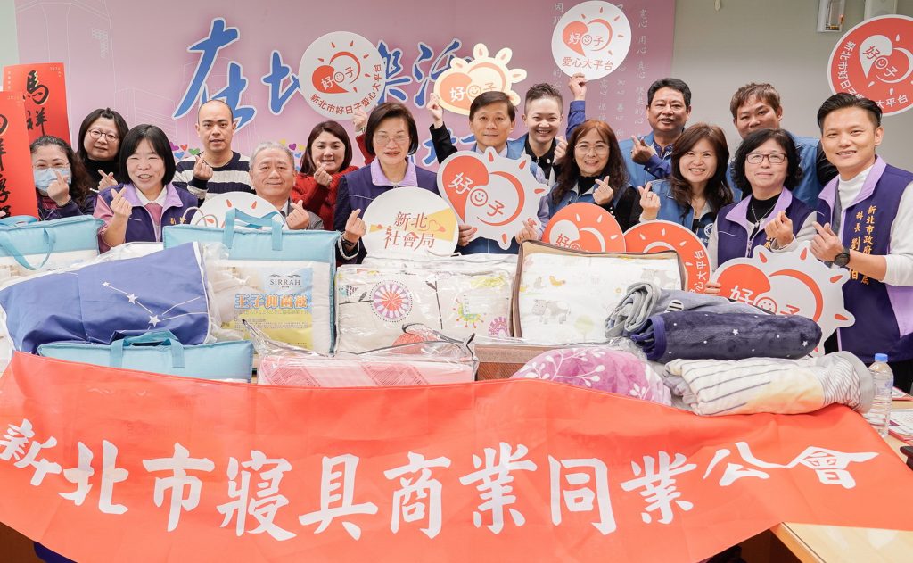 農曆春節將至,新北市寢具商業同業公會十日捐贈寢具一批,包括棉被、床墊、枕頭及保潔墊等,嘉惠新北市弱勢家庭及安置兒少,市府社會局長李美珍代表受贈並回贈感謝,感謝寢具公會的善舉,讓弱勢家庭及安置兒少擁抱著暖被,溫心過好年。