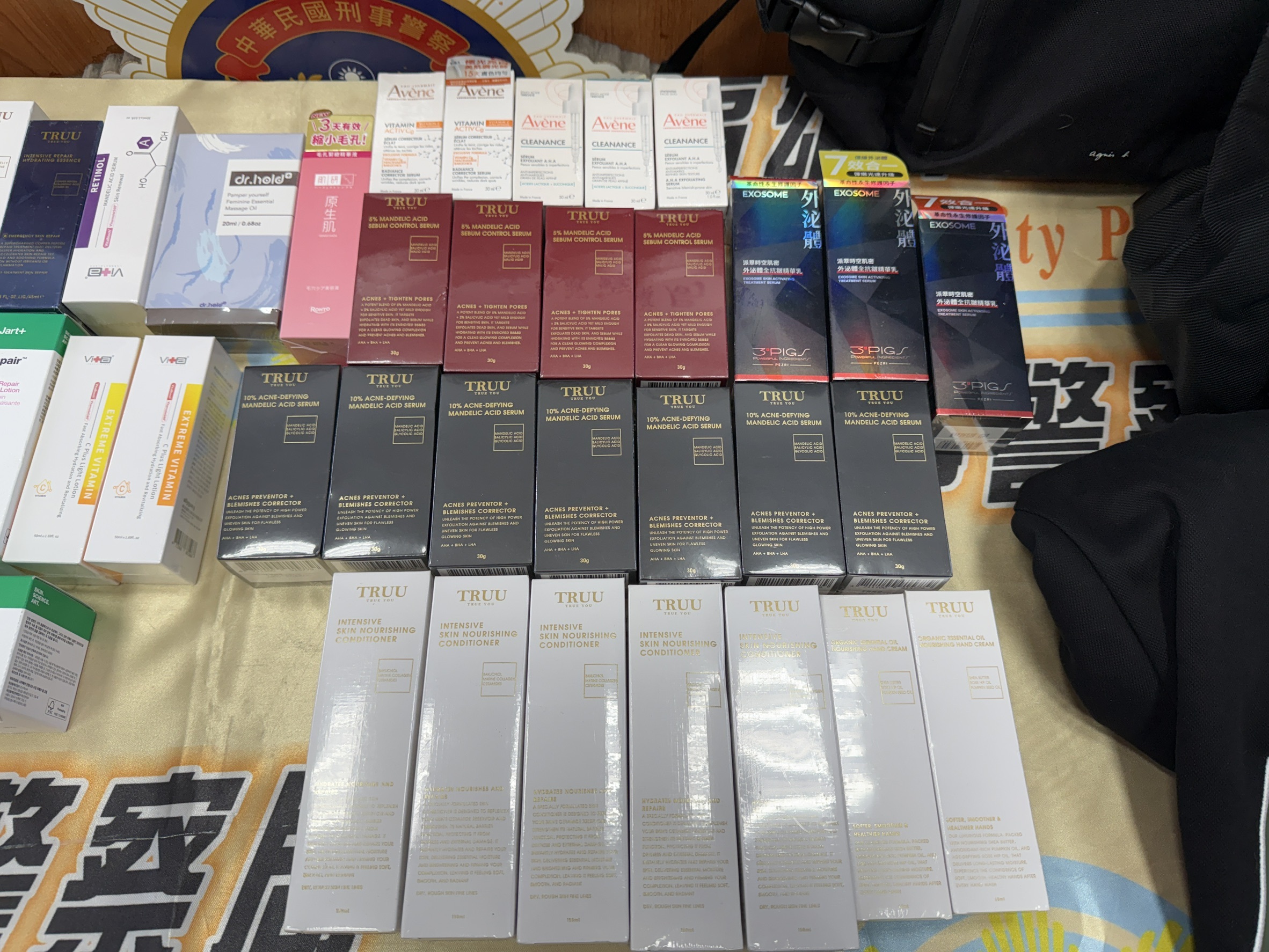 男子經營網購平台低價販售美妝商品,客戶下單後涉嫌前往連鎖藥妝店偷商品寄貨,得手近百萬元。警方在其租屋處查扣大批贓證物。(高雄市刑大提供,中央社)