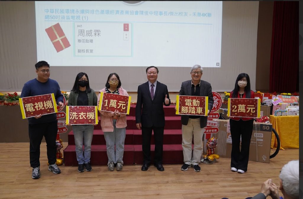 今年新春聯歡會感謝校務顧問、校友、企業友人及校內主管熱情響應,有近400多項摸彩獎品及普獎,包括電動腳踏車、電視機、洗衣機、紅包獎金餐卷及精緻實用禮品等多樣獎項「人人有獎」,尤其王政彥校長及歷任校長特別加碼大紅包,讓現場期待值一路飆升,現場驚呼聲、掌聲不斷,歡樂氣氛充滿整個會場。
