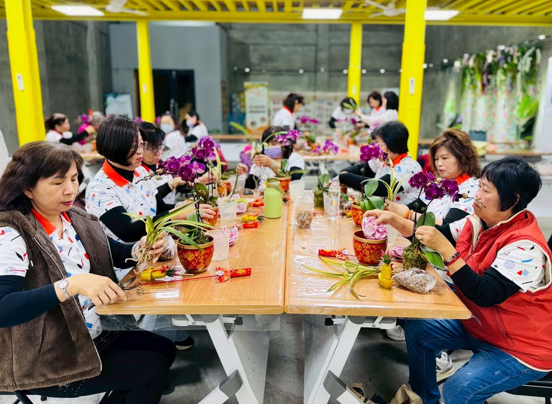 農曆春節腳步將近,台中市梧棲區農會十日上午洋溢著熱鬧新春氣息,由梧棲農會家政班舉辦幸福農村推動計畫推出花藝組合盆栽課程,吸引上百位家政班員共襄盛舉,親手完成一盆繽紛喜氣的年節盆栽,臉上滿是成就與喜悅,成為現場最溫暖的風景。