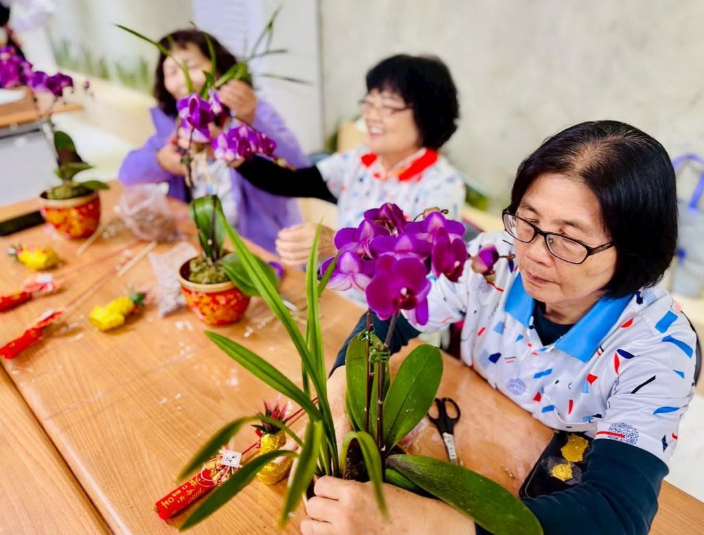 梧棲區農會表示,幸福農村推動計畫推出花藝組合盆栽課程,由梁巧慧老師帶領家政班員,以深紫色蝴蝶蘭搭配春蘭(國蘭),細心完成一盆屬於新年的祝福。深紫色蝴蝶蘭象徵高貴、富足與長久;春蘭內斂含蓄,寓意安穩與雅緻。兩種花材相互呼應,如同過年的期待——不鋪張,卻踏實,不喧鬧,卻富足。