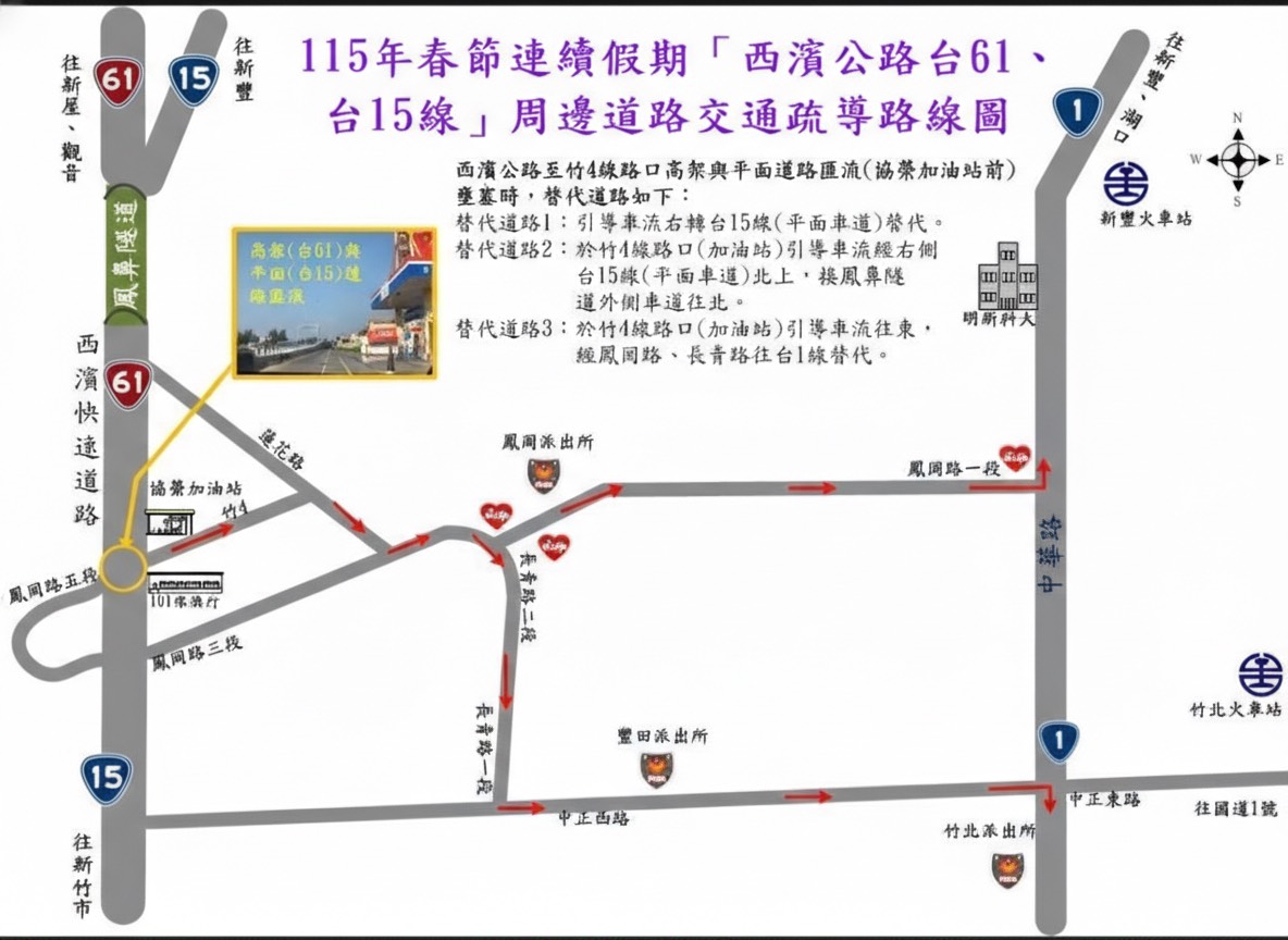 竹北警分局指出,轄內台六十一線西部濱海快速道路(鳳岡、豐田段)亦為南北重要交通樞紐將湧現大量返鄉車潮。西濱公路為台十五線與台六十線共線,於西濱公路與竹四線路口係高架道路與平面道路匯流(協榮加油站前)處,屆時匯流車潮恐造成壅塞,建議用路人遇有道路壅塞情形時,改走替代道路。