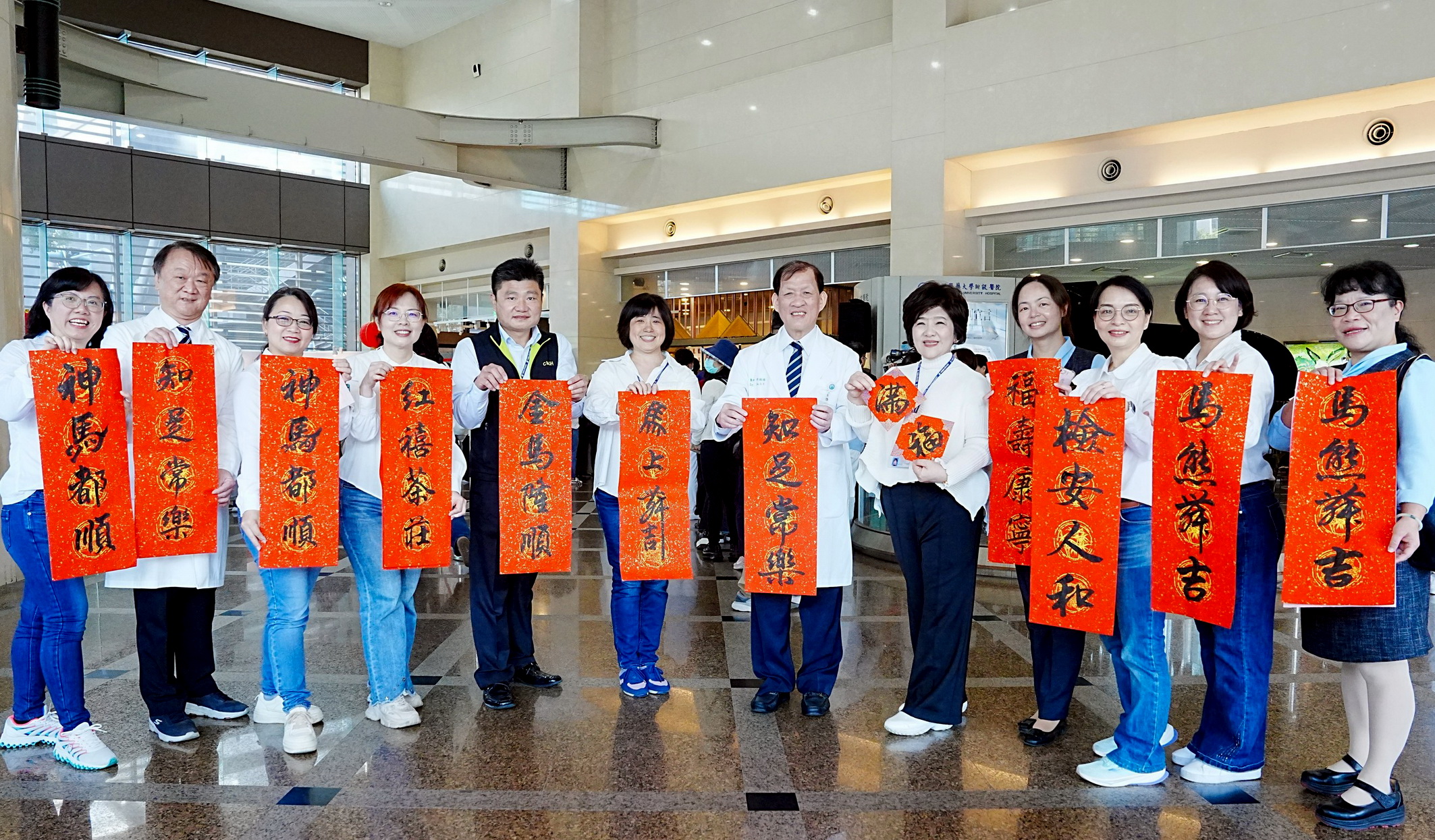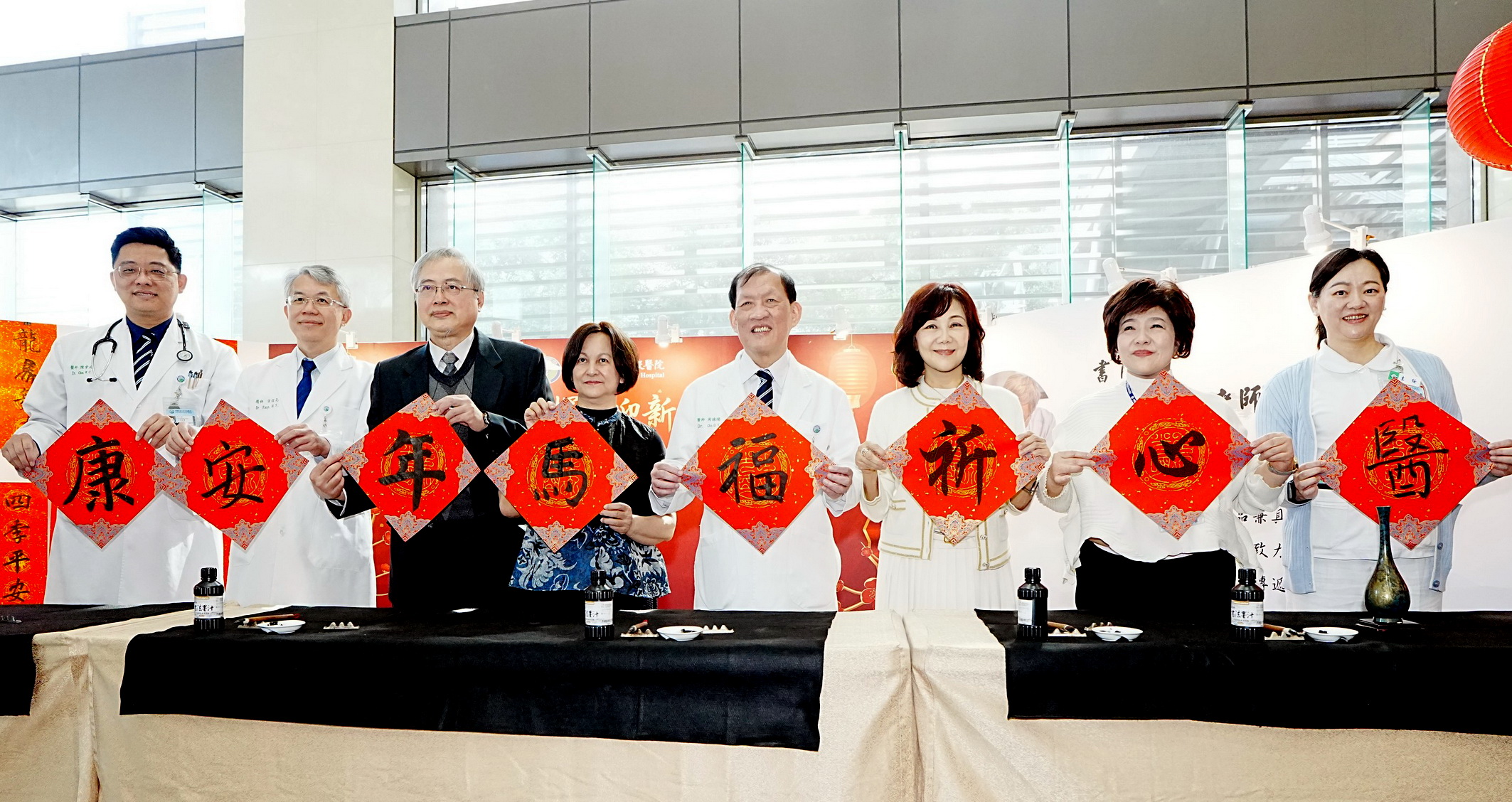 院長周德陽特別邀請書法名家吳運進蒞臨,偕同中醫大暨醫療體系董事長夫人林嘉琪、周德陽院長夫人許莉莉與醫院主管群共同開筆,揮毫寫下「醫心祈福 馬年安康」,為全體員工、病人及家屬誠心祈願新的一年平安順遂、福康相伴。