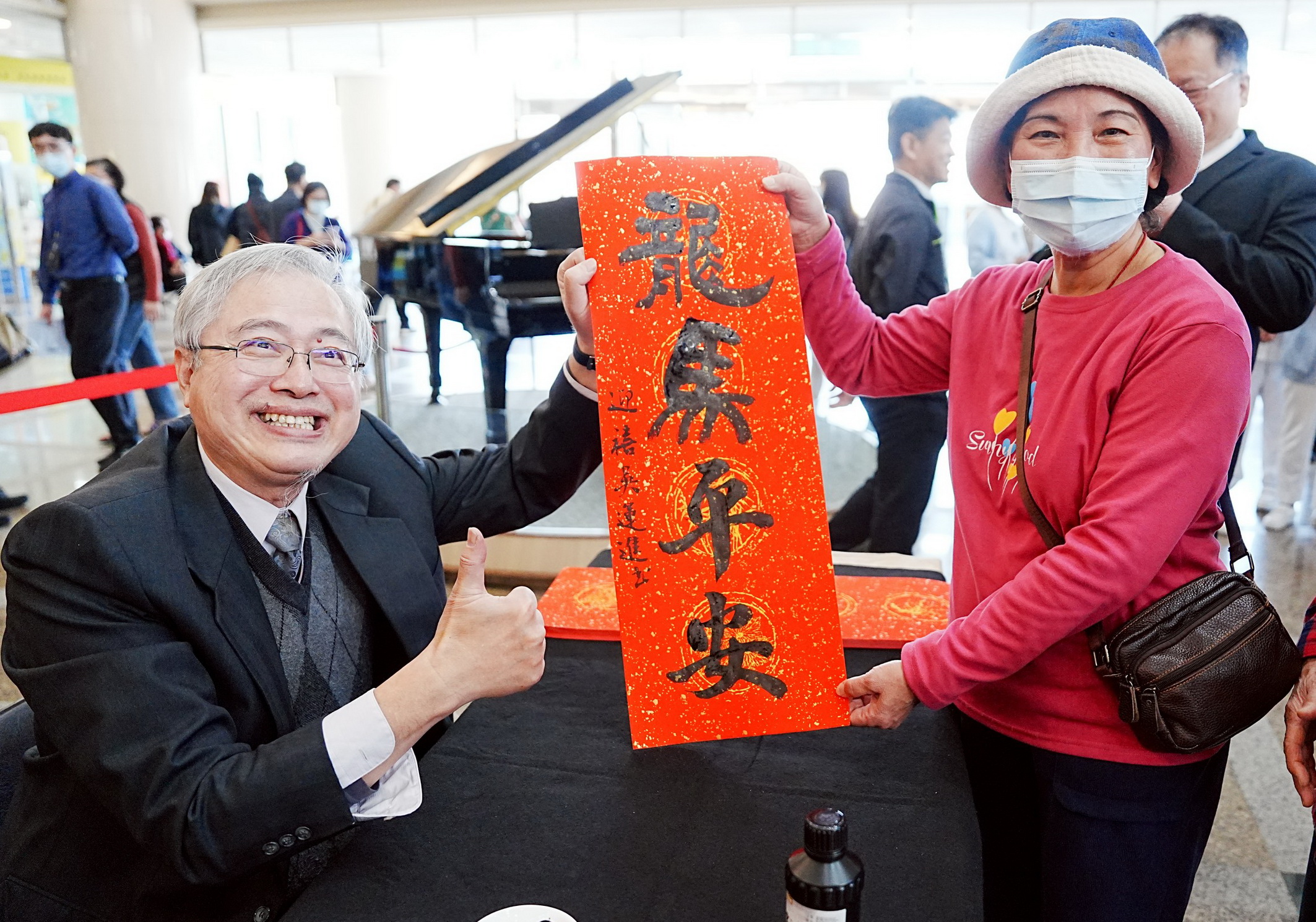隨後,由吳運進老師率領多位得意門生現場揮毫書寫春聯,共同寫下「馬到成功」、「吉祥如意」、「平安健康」等各式吉祥話,吸引員工、病人與民眾熱烈索取,現場人潮絡繹不絕,在一筆一畫間,為歲末送上溫暖祝福,也為新的一年寫下美好期盼。