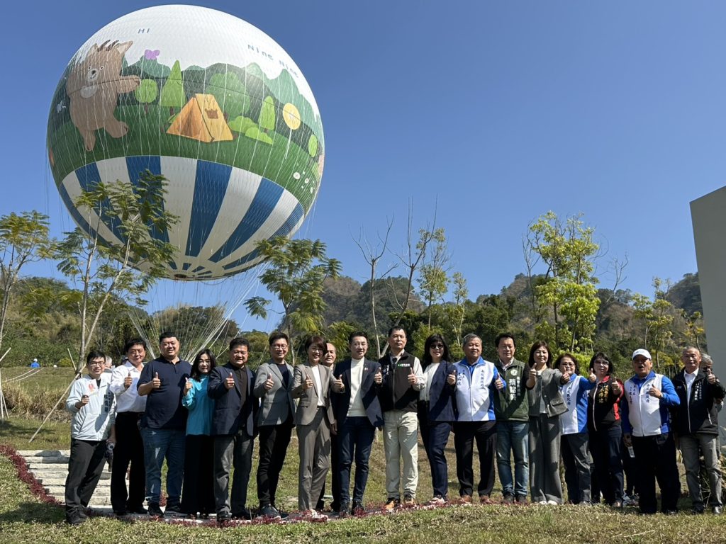 立法院副院長江啟臣與南投縣長許淑華、立委馬文君、游顥等人十一日共同出席,為南投縣草屯鎮「九九峰氦氣球樂園」開幕剪綵,見證全台首座氦氣球樂園的啟用。