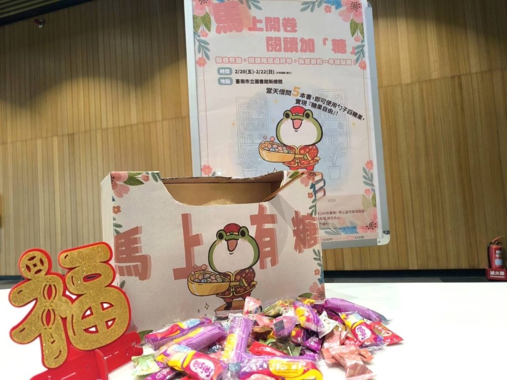 書中自有甜滋味!過年走春不只拜廟、逛老街,還能至圖書館借書呷甜甜!台南市立圖書館新總館春節期間推出一系列新春限定閱讀活動,邀請讀者在年節假期走進圖書館,借書、拿春聯、玩活動,為新的一年「加糖、加分、加好運」,市圖也化身為「閱讀糖果屋」,歡迎所有人「舀」出好運勢。