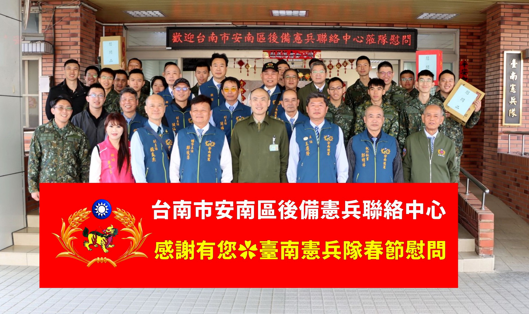 安南區後備憲兵聯絡中心的春節慰問工作,尚包括榮譽主任鄭枝厚、輔導主任陳信融、財務長許胞海、文宣長及副主任蘇良杰等二十二人,受到新到任的台南憲兵隊隊長李成嘉上校熱烈歡迎。