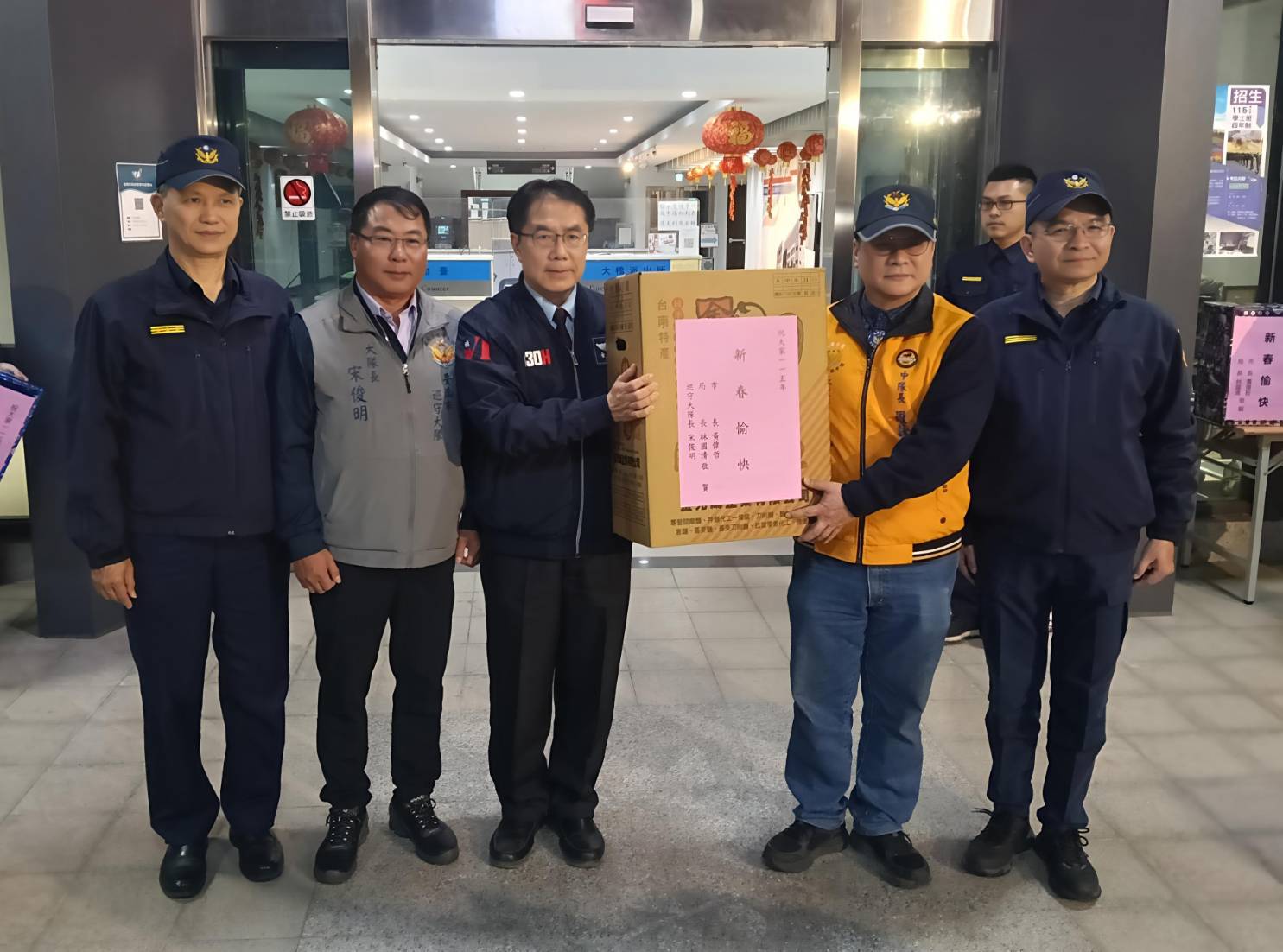 慰問過程氣氛熱絡,市長除致贈慰問品並與執勤警民力合影留念,也祝賀大家「一馬當先 馬到成功 新年快樂」。陪同的還有守望相助大隊大隊長宋俊明、大台南警察之友會理事長蔡明憲、台南市警察之友會理事長鄭丞焜、義警大隊副大隊長黃坤山等人。