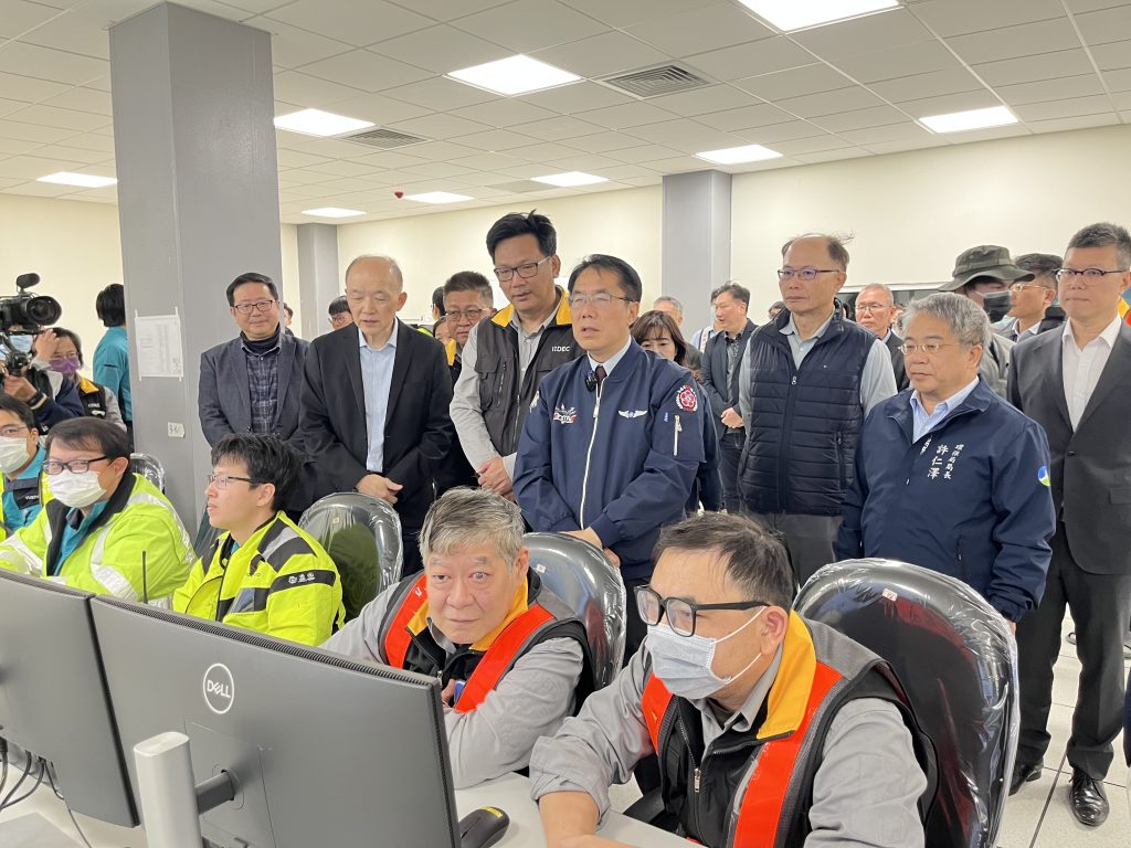 黃偉哲視察城西焚化廠中控室,了解更新爐系統運作與後續試運轉規劃。 (環保局提供)