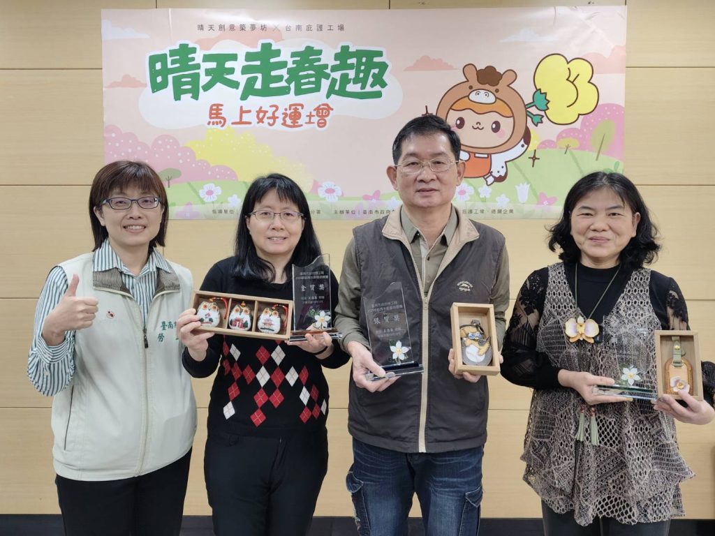 南市勞工局「2025晴藝獎-手創藝品競賽」前三名得獎者公布,金質獎由吳貞慧《Owl古蹟公仔》脫穎而出,吳佳陽《馳遠千里·駿躍本壘》獲銀質獎,吳林麗蘭《以蘭為行·以旅為詩》拿銅質獎,作品具台南元素和馬年意象,讓人愛不釋手。