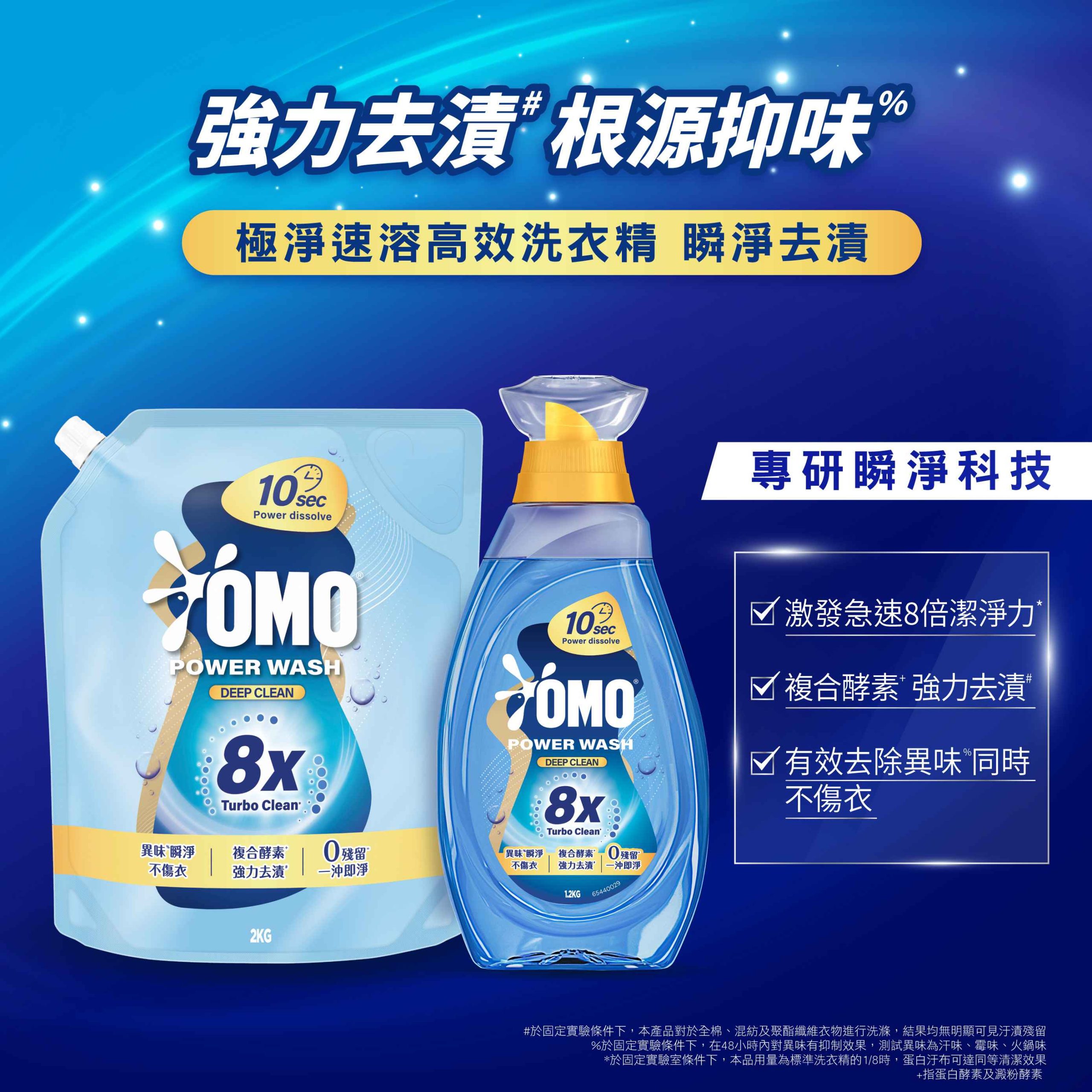 OMO 強效去漬 根源抑味 極淨速溶高效洗衣精 瞬淨去漬。圖/聯合利華提供
