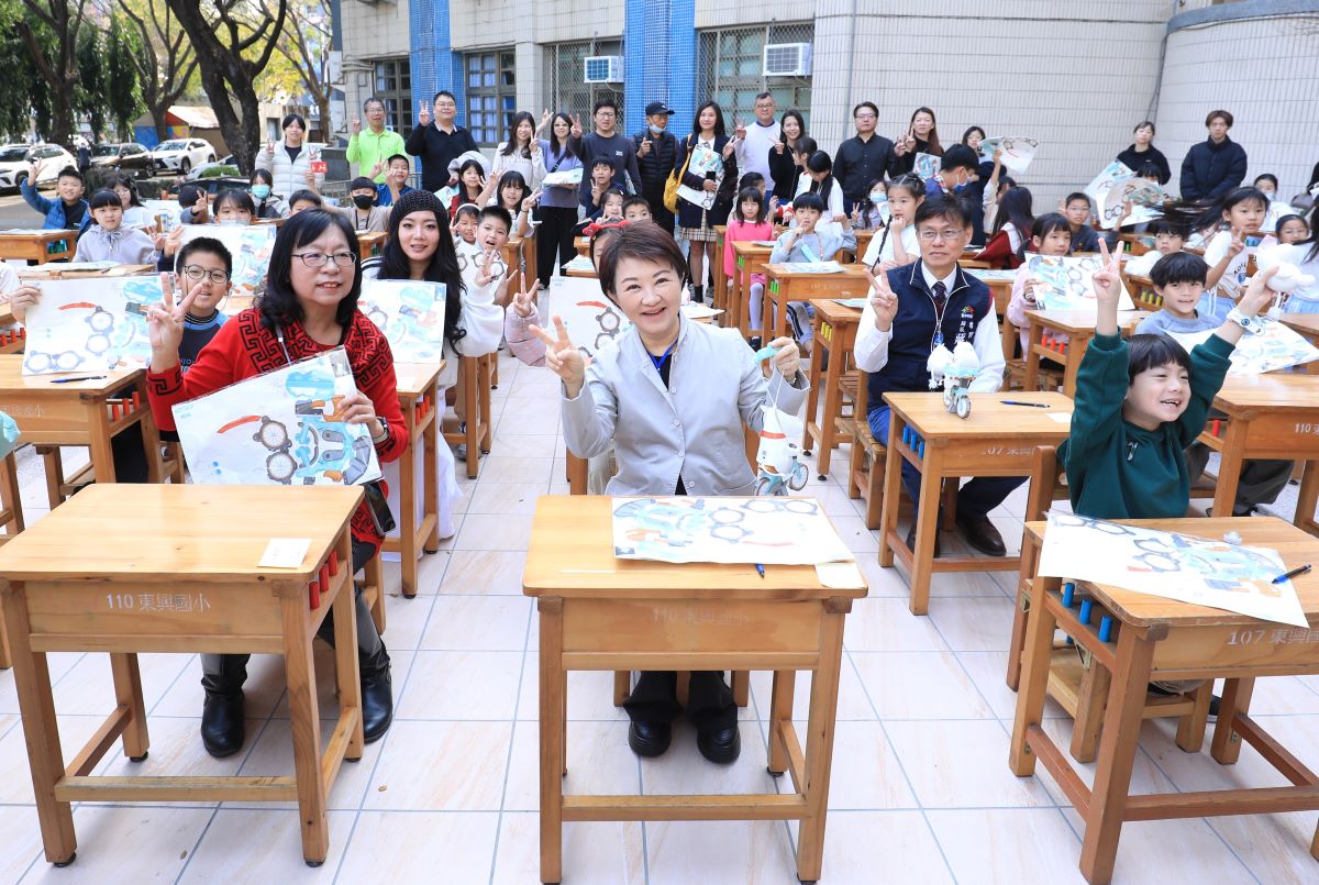 市長盧秀燕前往東興國小關心學生領用第二期汰換掉的課桌椅情形。(記者楊文琳攝)