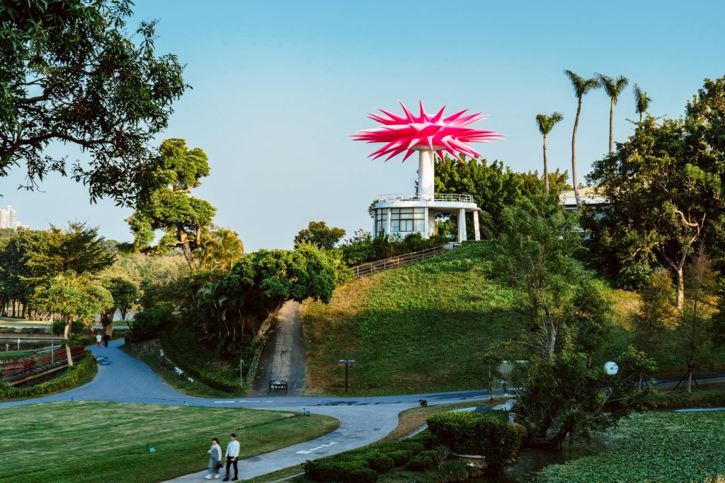 本次藝術裝置作品亮點十足,藝術家的精彩創意讓觀眾紛紛直呼「太萌了」,首度來台的英國藝術家 Steve Messam,以《Crown 冠》一作為果嶺自然公園的圓塔上戴上了一頂粉紅色的絢麗冠冕,三十四個錐形尖刺在十公尺高處綻放,彷彿為原有建築注入了神奇魔力。