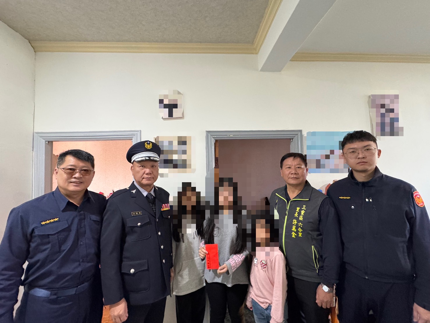 農曆年節將至,三重警分局厚德派出所副所長鄭人綜、警員蕭博文,會同轄內六合里里長許萬金及三重義警中隊長許誥,攜手合作寒冬送暖,主動深入社區關懷轄內之弱勢家庭,致贈春節慰問金,讓弱勢家庭在冷冽的冬天,感受到溫暖的人情味。