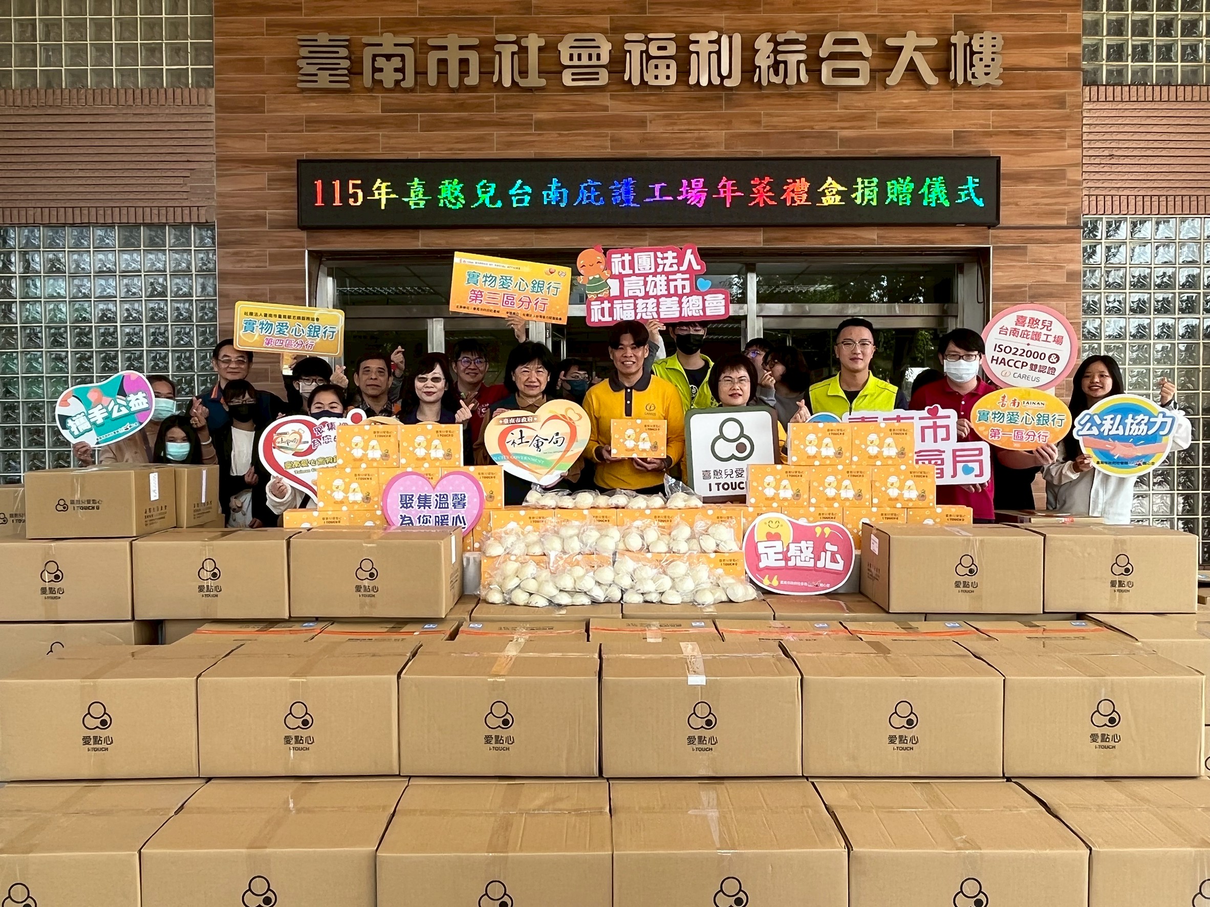 市長黃偉哲也特別感謝喜憨兒台南庇護工場長期對弱勢族群的關懷,一0八年十月捐贈鮮凍食品五0六組、一一0年十一月提供防疫食品物資一0五箱,一一二年六月捐贈三百份端午節物資,一一三、一一四年也連續捐贈年菜禮盒,今年再度捐贈八三0份年菜,分送對象也將涵蓋南市實物愛心銀行服務個案及社會局關懷之脆弱家庭等弱勢家戶。