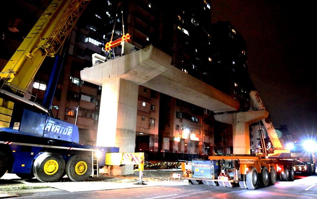 新北捷運工程年前重大進展,土城樹林線樹林段第一跨預鑄梁昨凌晨成功吊裝完成,使程進入上部結構施工期。 (新北捷運局提供)