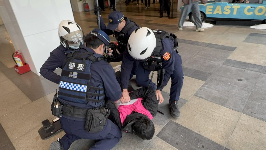 基隆警方演練隨機攻擊突發狀況,以假勢警力壓制互徒。(記者張上耕翻攝)