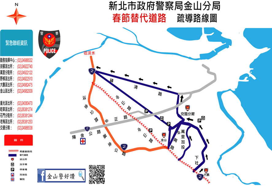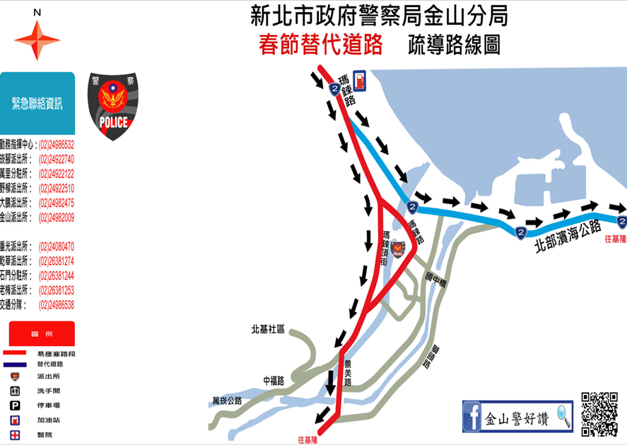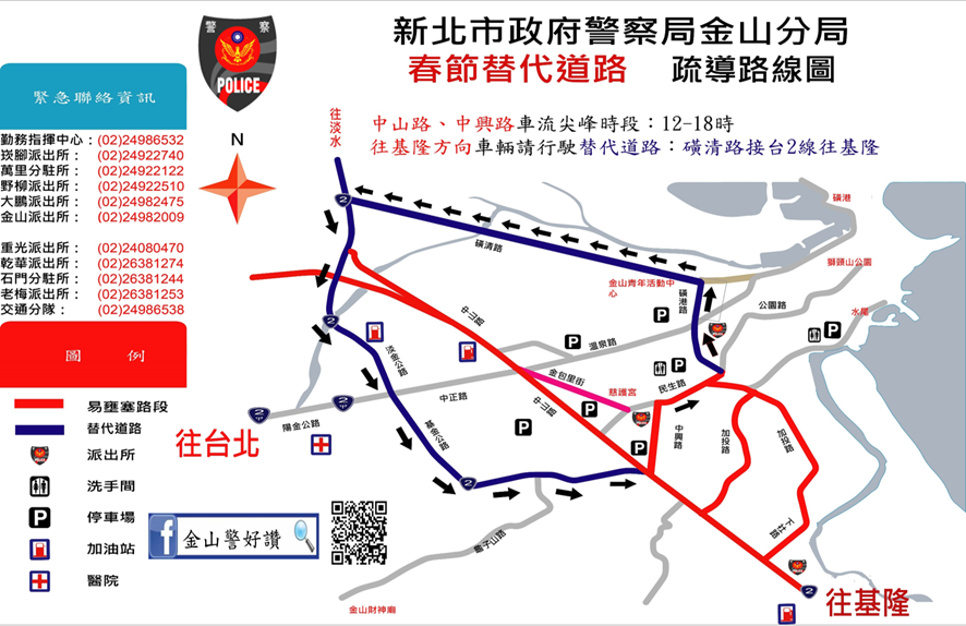 過年將至,今(115)年春節連續假期長達9天,北海岸有許多熱門景點(如北海岸石門洞、野柳風景區、金包里老街等)及知名廟宇(如金山慈護宮、金山財神廟、野柳保安宮、法鼓山等)將吸引大量走春遊客前往旅遊及參香祈福,金山警分局為有效疏運及分散車流,避免交通壅塞情形,自明(14)日起至22日止,將針對易壅塞路段實施交通疏導管制,用路人可參考替代道路路線資訊改道行駛,避開主線道車流擁擠,除了節省堵車等候的時間,還能共同維持交通順暢。