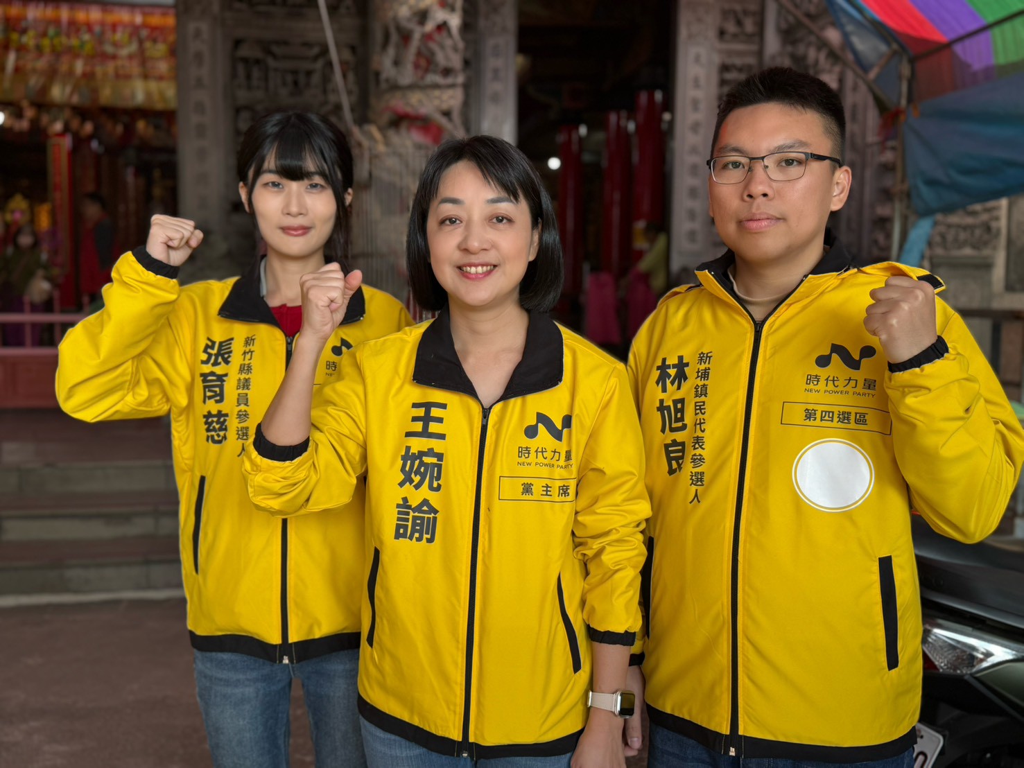 力拼第二個時力議會黨團,主席王婉諭(中)在竹北天后宮前強調,至少提名三席參選竹縣議員。(記者彭新茹攝)