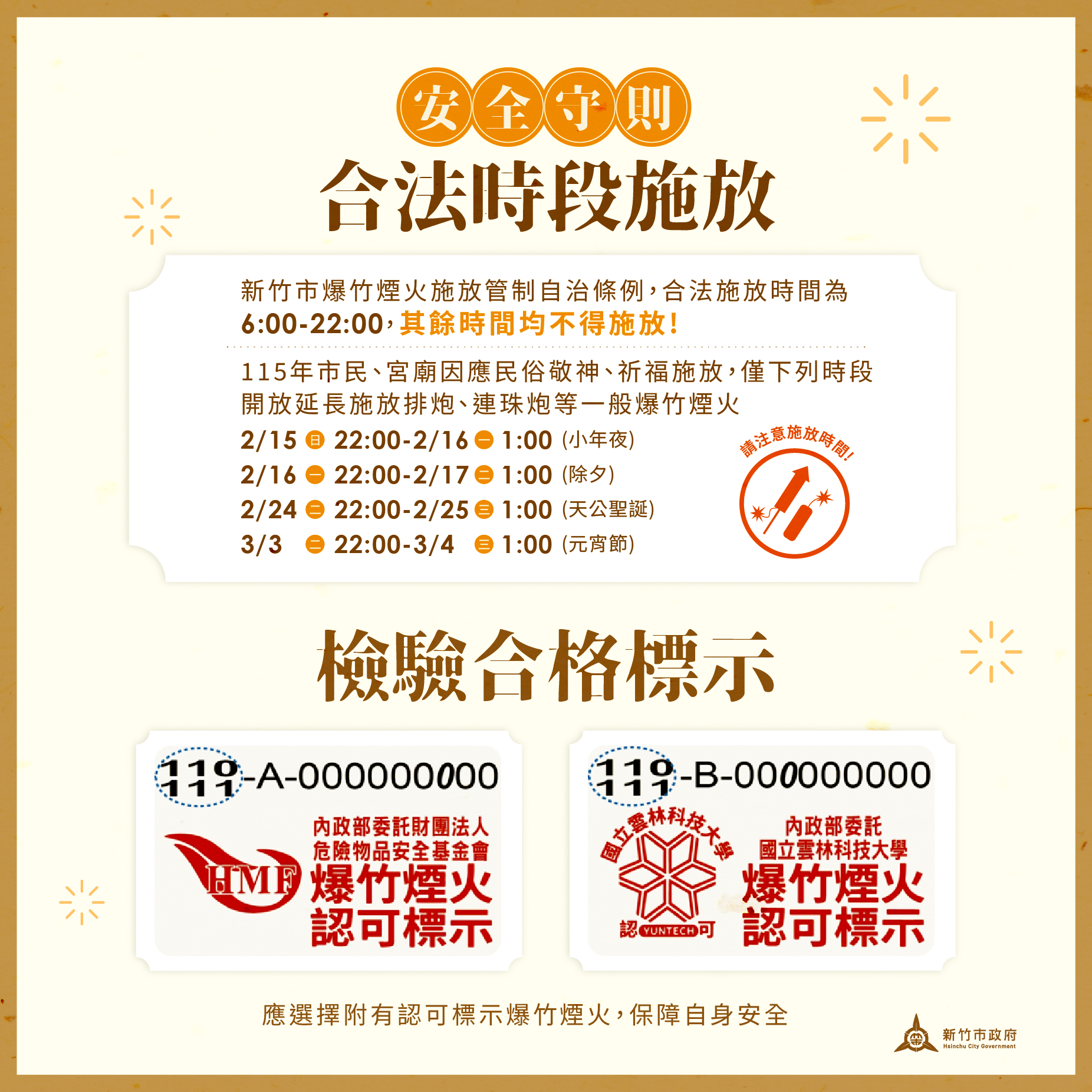 消防局提醒,依據竹市爆竹煙火施放管制自治條例,一一五年度除農曆小年夜、除夕、天公聖誕及元宵節,因應民俗敬神、祈福施放,開放延長施放排炮、連珠炮等一般爆竹煙火到翌日凌晨一時,其餘時間每日六時前、二十二時後均不得施放爆竹煙火,違規施放將依法處以新臺幣三萬元以上十五萬元以下的罰鍰,在漁港等十種特定場所及區域內,禁止施放爆竹煙火,違規者將依照場所類別,分別處以新臺幣三萬元以上、十五萬元以下,或新臺幣六萬元以上、三十萬元以下罰鍰。