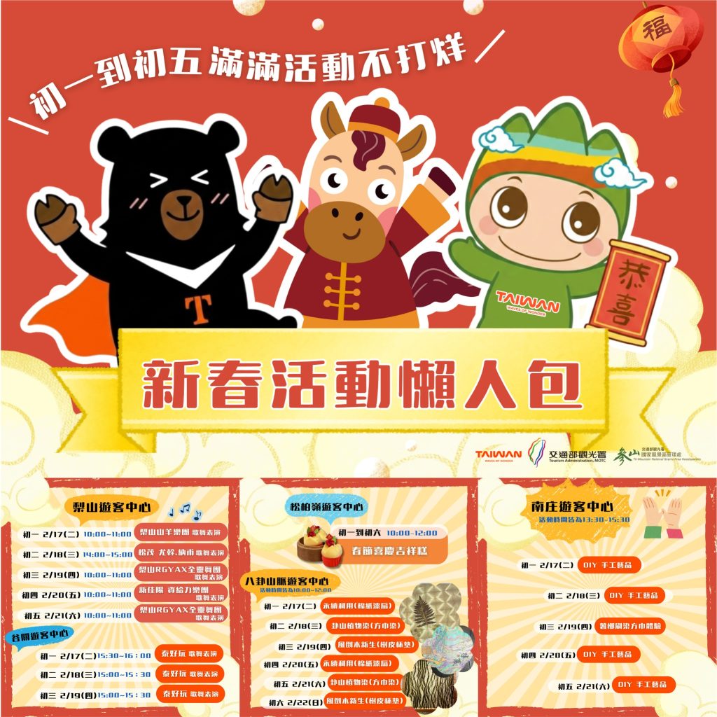 參山處表示,大年初一至初三民眾前往轄內六大遊客中心完成指定任務追蹤+按讚,可獲得限量馬年好運錢幣;初一至初五並推出多樣化的DIY手作體驗。