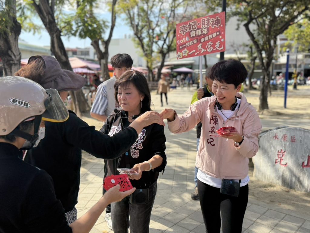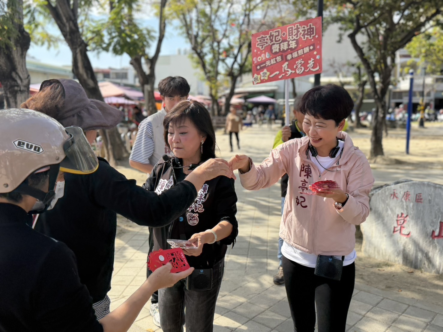 小年夜一早,台南各傳統市場湧入人潮,民進黨立委、台南市長參選人陳亭妃偕同市議員陳碧玉、李偉智、陳秋萍,十五日清晨走入新市、新化與永康等地市場,下午則到東區的市場拜年,財神爺陪伴,沿途發送「一元復始紅包」與「幸福煎餅」,吸引不少民眾圍觀與排隊領取,現場洋溢著濃濃春節喜慶氛圍。