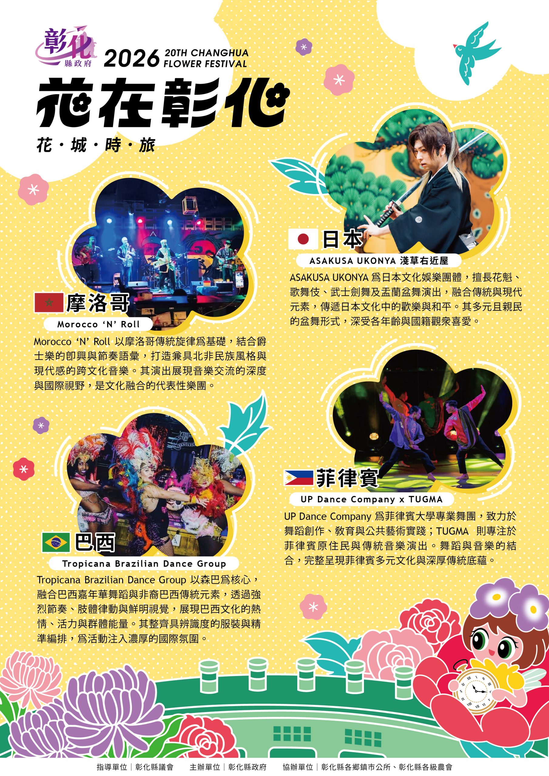 初一到初六「花在彰化」將由巴西「Tropicana Brazilian Dance Group」以森巴舞蹈為核心,融合嘉年華舞步與非裔巴西傳統元素,充滿張力的肢體律動,詮釋南美洲蘊含的熱情、活力與互動精神;摩洛哥樂團「Morocco‘N’Roll」則以北非傳統旋律為基礎,結合爵士樂的即興精神與多變節奏,在音符流轉間交織出跨文化融合的音樂風貌。
