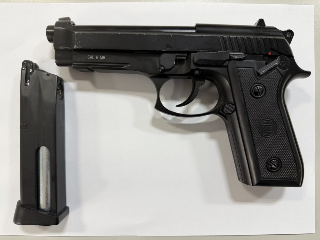 新店警分局表示,員警後於王男(23歲)駕駛之自小客車置物櫃內起獲瓦斯鎮暴槍2把、彈匣2個,遂將王男及副駕駛座乘客楊男(21歲)帶返所製作警詢筆錄,全案依恐嚇及違反社會秩序維護法函請台灣台北地檢署偵辦。
