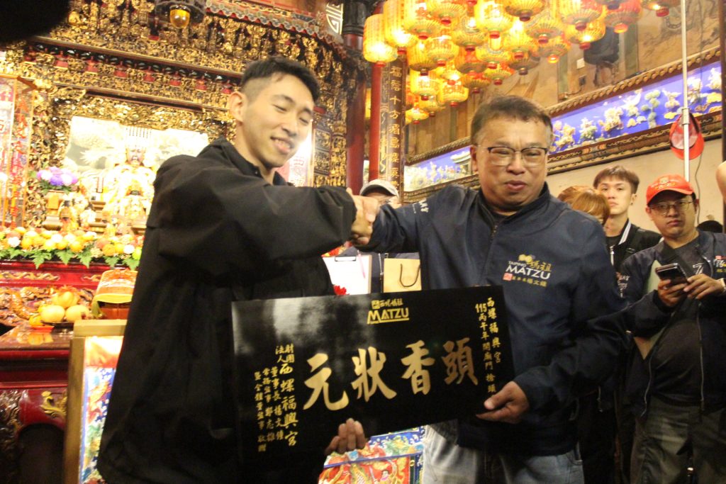 福興宮董事長楊文鐘說,感謝來自各地眾多信眾來福興宮陪太平媽守歲團圓、慶太平,希望新春大家相揪來西螺純樸小鎮走春、拜媽祖、嚐小吃,感受西螺人的濃厚人情味;隨即致贈頭香狀元匾額,以及開運紅包九九九九元和文創商品給廖博彥,祝賀心想事成、諸事如意。