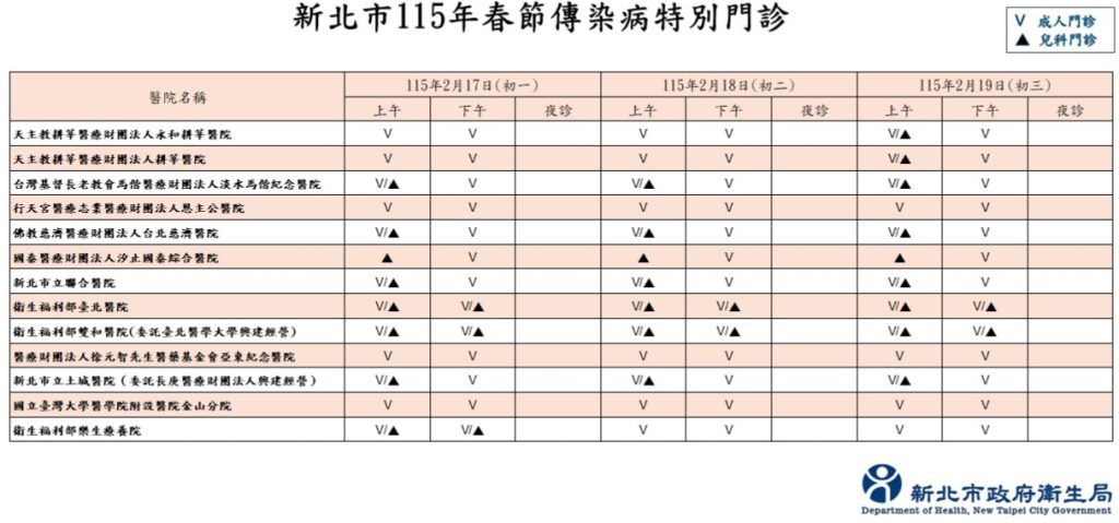 農曆春節假期,民眾闔家團圓、人流南來北往頻繁之際,往往也是呼吸道疾病疫情的高峰期。為確保民眾於春節期間能有充裕的就醫管道,新北市衛生局協調轄內醫院於初一到初三期間(2月17日至2月19日)增設「傳染病特別門診」分流急診壅塞,以兼顧醫院急重症醫療量能及品質。