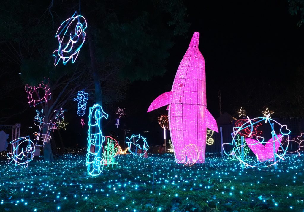 海線特色燈組以海豚躍出海面的姿態,結合波光粼粼的燈光設計,象徵守護海洋平安吉。(記者陳金龍攝)