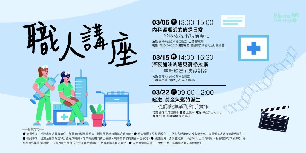 為讓民眾深入了解護理專業的真實面貌,基隆市公共圖書館舉辦「職人講座」系列活動,三月六日下午一時至三時,將於安樂分館多功能活動室推出專題講座「內科護理師的偵探日常:從線索找出病情真相」,邀請基隆長庚醫院專科護理師鄭惠芳擔任講師,帶領民眾一窺白衣天使在醫療現場抽絲剝繭、守護生命的日常。