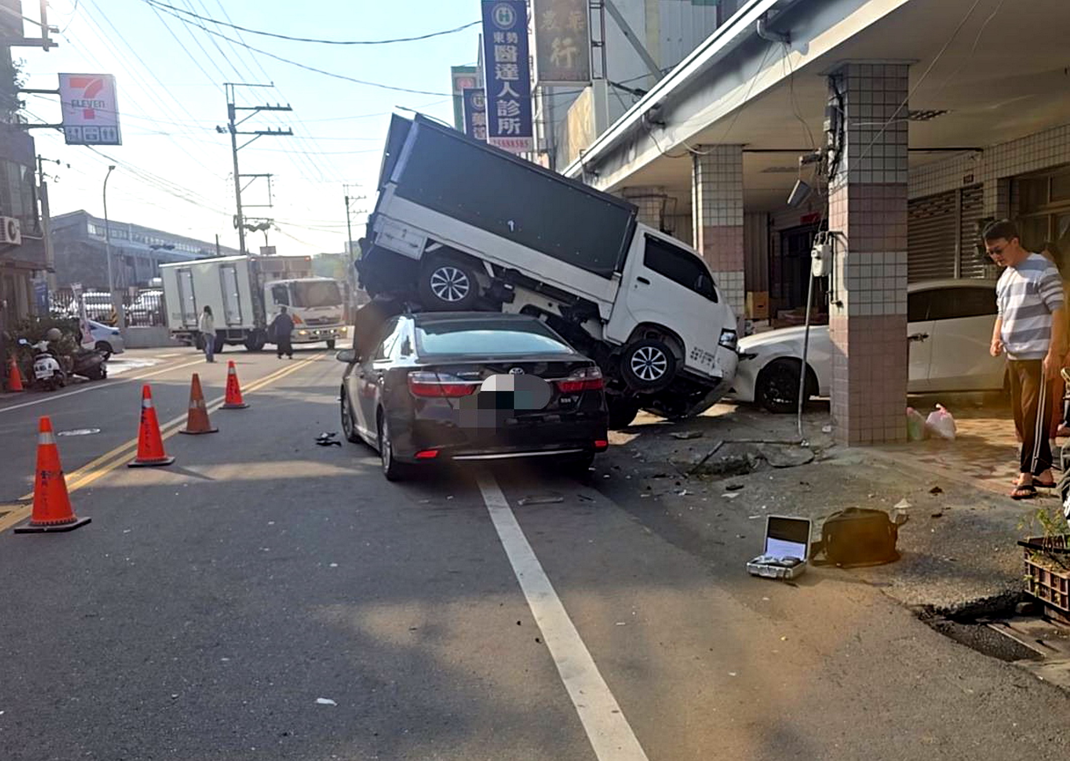 台中市東勢區東坑路二十一日下午發生一起離奇車禍,轎車撞上停放路邊的小貨車後,強大衝擊力道竟將小貨車鏟翻並壓在轎車車頂,還波及另一輛轎車,駕駛和乘客受傷,他自稱疲勞恍神,警方調查無酒駕,肇事原因由警方調查中。