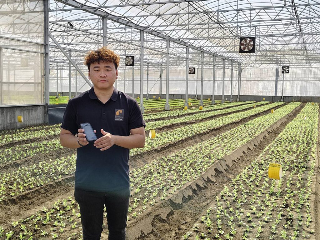 賴策方在自家農場跟著員工學種菜、採收,整地作畦、生物防治,一邊學習,也一邊觀察如何能透過建置一貫化自動化農機生產設備,減少農業所需勞動力、提升生產效能。