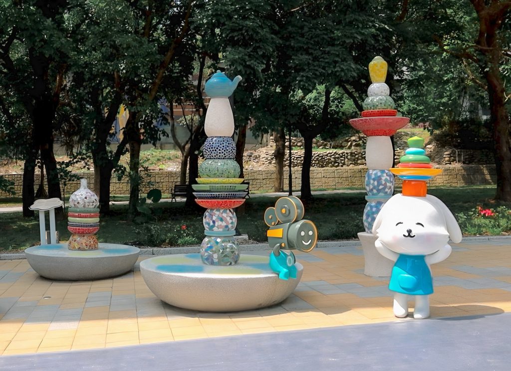 《有趣》則由日本藝術家大塚麻子創作,作品理念源自於鶯歌風貌,凸顯了陶瓷平衡堆積的模式,充滿和諧美感且富有在地文史風情,並將公共藝術繪本內的小淘氣與卡麥啦融入作品當中。