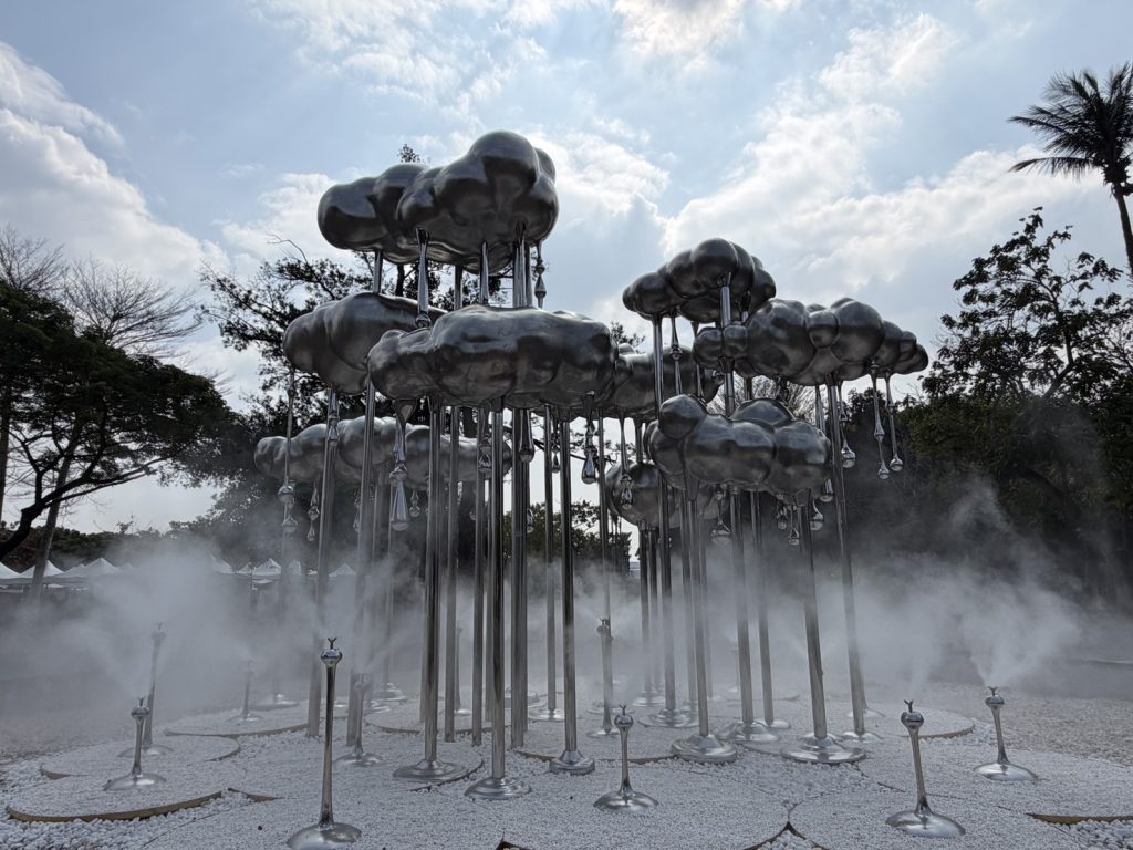 水道館方指出,中央圓環在日治時期原為噴水池所在,後因設施變遷逐漸荒廢。此次藝術家以不鏽鋼打造層疊雲朵,搭配定時水霧系統,霧氣自林間升起,在陽光下折射微光,重現水源地氛圍,也喚起歷史記憶。