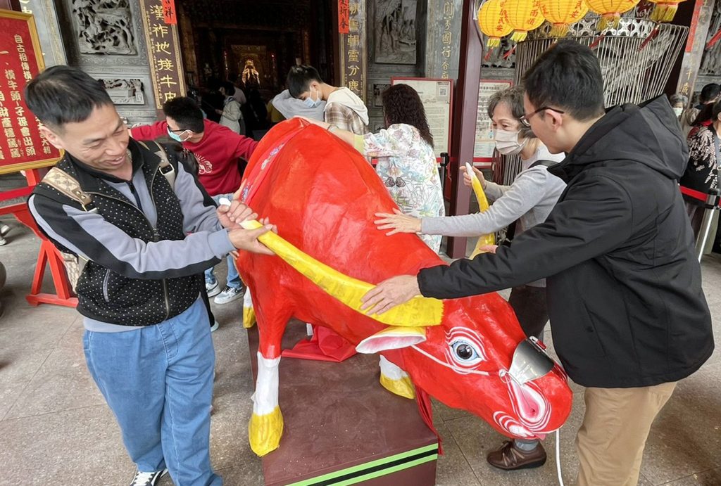 古人於立春前製作春牛,讓文武百官在立春祭典中以彩杖鞭策,象徵春耕的開始,現代演變成「摸春牛」習俗,意在學習牛的勤奮精神,並祈求新的一年萬事如意,心想事成。春牛擺放在聖母廟五王殿前,春節期間吸引不少善信、遊客摸春牛討吉利