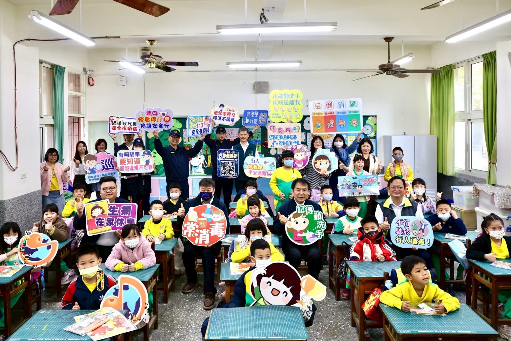 黃偉哲到新民國小視察,與學生親切互動,並以有趣問答方式,向學童宣導腸病毒、流感與登革熱等防疫重點,叮嚀要勤洗手、戴口罩、接種疫苗與維持良好衛生習慣等防疫知識;也向親師生等宣導「車輛慢看停、行人安全行」的交通安全觀念,降低意外事故傷害發生。