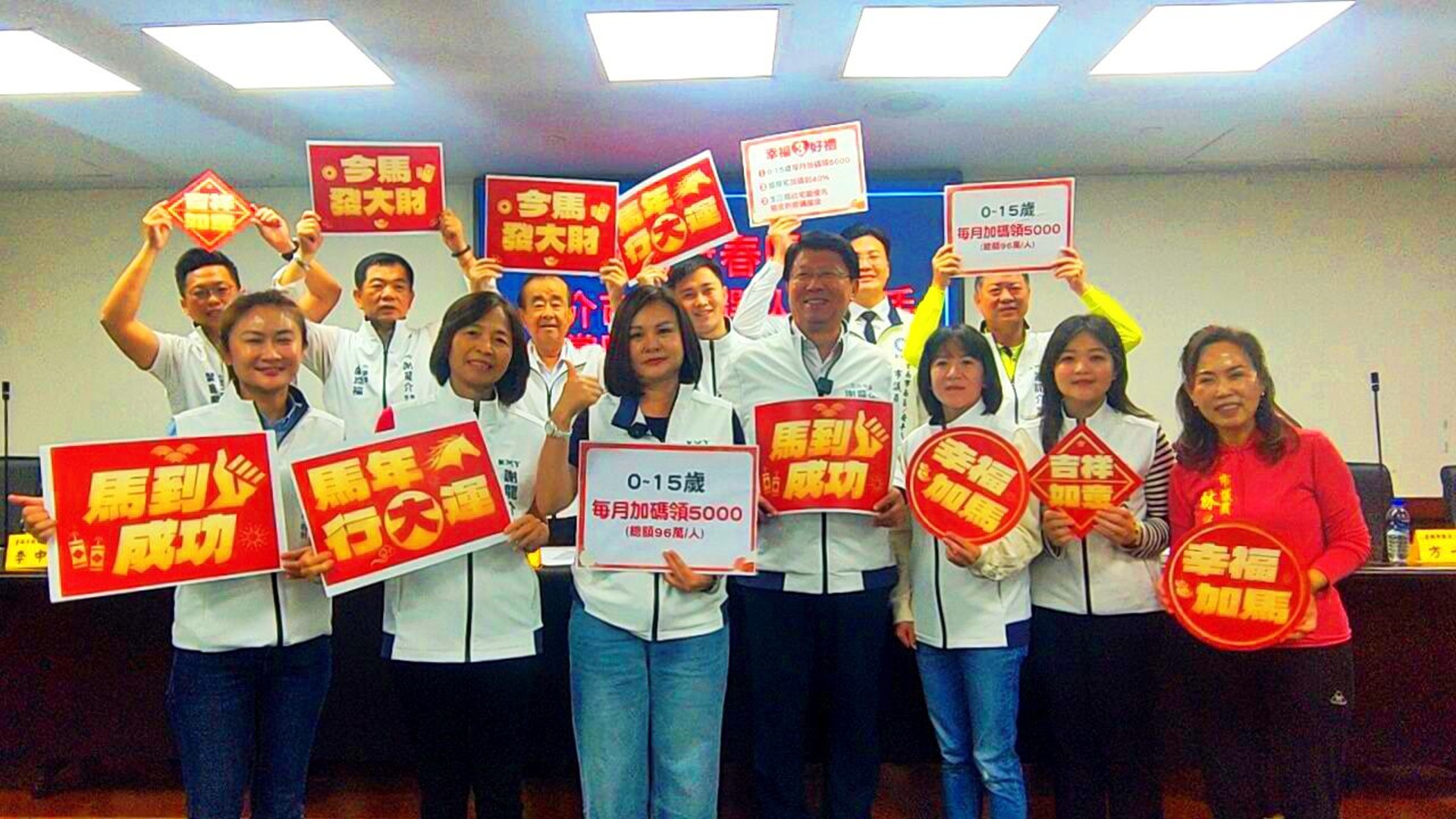 國民黨市長參選人、立委謝龍介23日和黨團成員共同召開記者會,除向民眾拜年,也提出「幸福3好禮」政策,包括0至15歲每月加碼5千元、婚育宅加碼至4成、婚育宅租金可抵購屋金。謝龍介表示,請市民在投票時,將手中選票,換快樂幸福門票。