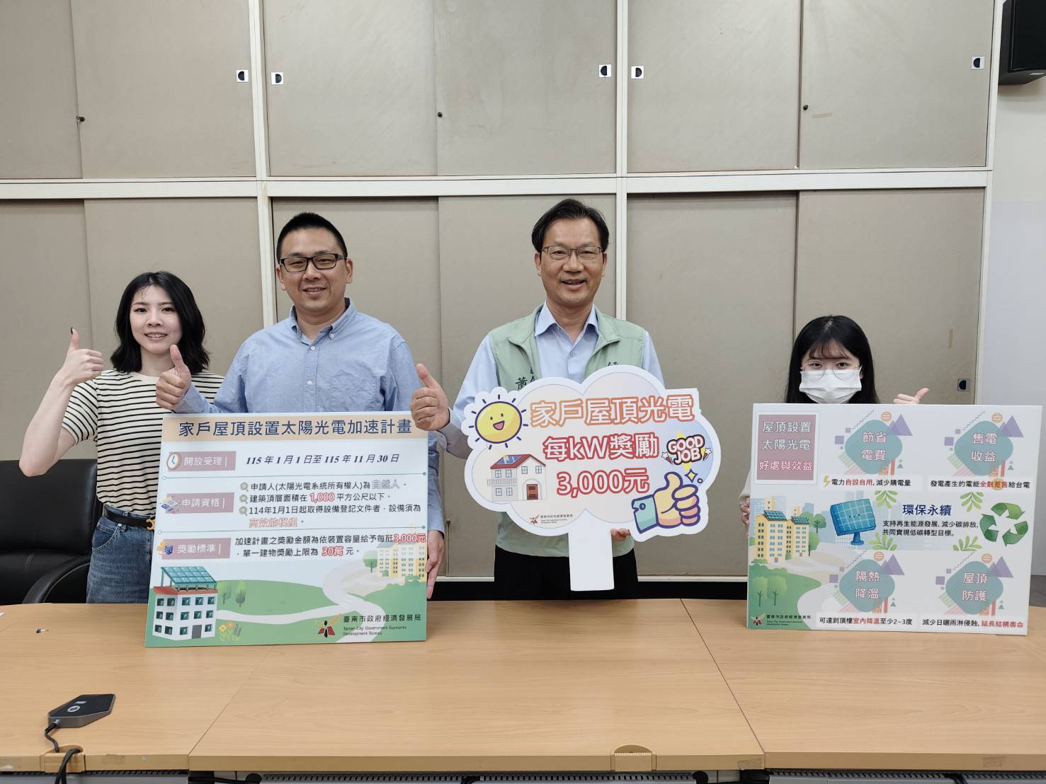 配合中央推動再生能源政策及台南市家戶屋頂光電發展方向,經發局向中央爭取「家戶屋頂設置太陽光電加速計畫」,並依推動實務需求修訂相關作業規範,鼓勵自然人參與屋頂光電設置,目前獎勵補助計畫已定案,民眾如屬一一四年一月一日起取得設備登記文件者,則可由今年起至十一月卅日期間提出獎勵申請。