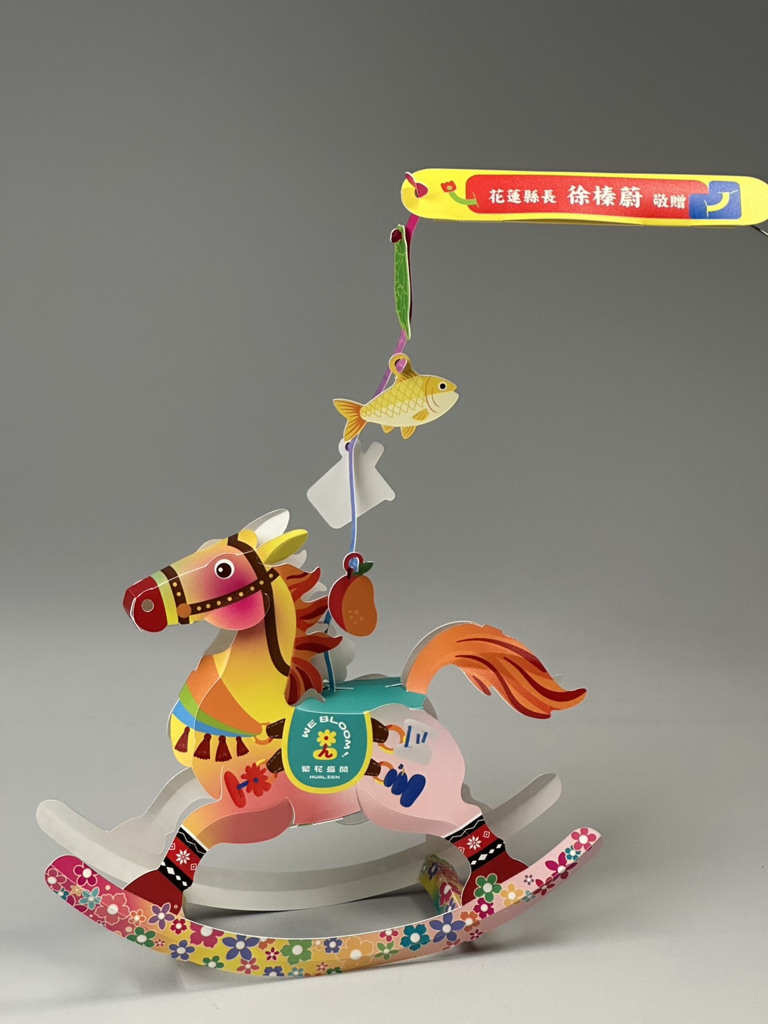 其中馬身上的小石花,不僅代表花蓮豐富的自然景觀,更融入花蓮為石頭故鄉之幾何線條及多彩文化。 提燈底部搖馬弧形底板及馬身點綴著大量鮮艷的花卉圖案,象徵花蓮各族群的和諧共榮,以及對未來生活「繁花盛開、欣欣向榮」的美好寓意。