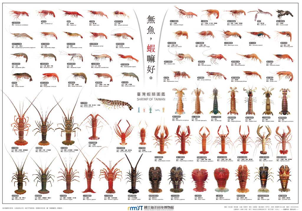 海科館表示,蝦類圖鑑海報賦予「無魚,蝦嘛好」全新的生態解讀:「在海洋生態系中,蝦類從來不是配角,從體型壯碩的龍蝦到微小的浮游蝦類,牠們均屬海洋中的重要的角色。」今年推出的圖鑑海報呈現台灣常見的食用蝦類,透過物種圖像與名稱標示,讓民眾從熟悉的餐桌經驗出發,認識不同蝦類在外型、分類與生態特性上的差異,進一步理解日常食用的蝦類其實具有高度多樣性。