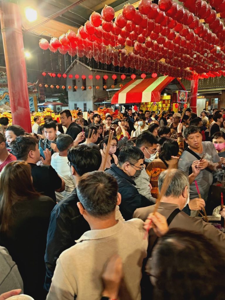 天壇廟埕的供桌擺滿金紙、餅乾、花束,工作人員忙者將信徒祭拜的金紙打包,照牆前的金紙堆疊如小山。周邊的忠義路、民生路、民權路、公園路段車多壅塞,廟方動員志工疏導交通,並針對聯外巷弄道路進行交通管制。