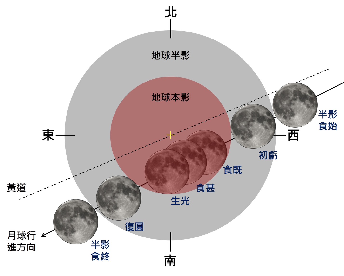 氣象署指出,由於三日當天的「半影食始」階段尚未月出,因此將無法見到此階段食相,十七時五十分左右月亮東升時,就已進入初虧階段,天文上稱為月出帶食。