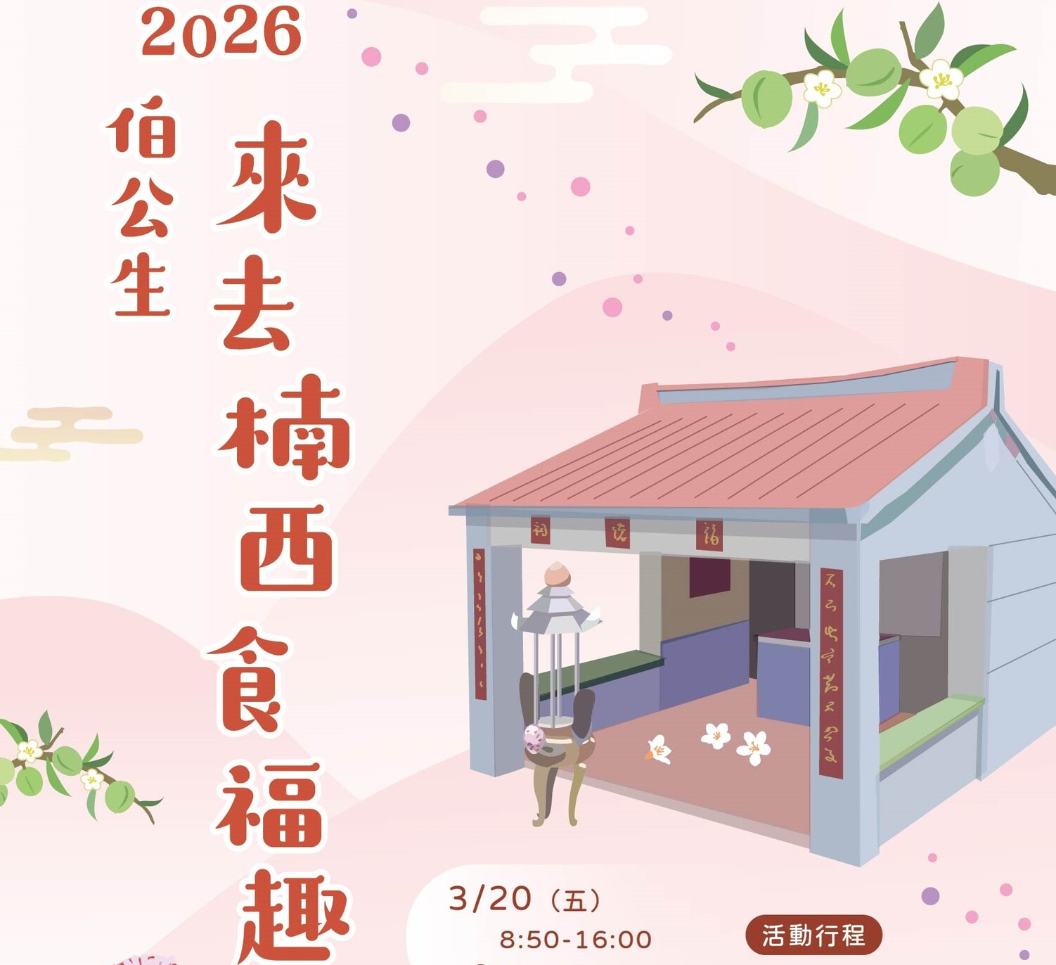 為迎接客家文化傳統中具有重要地位的土地公誕辰,市政府客家事務委員會今年特別規劃「伯公生」楠西小旅行,二十六日起開放報名,限額八十名,額滿為止。