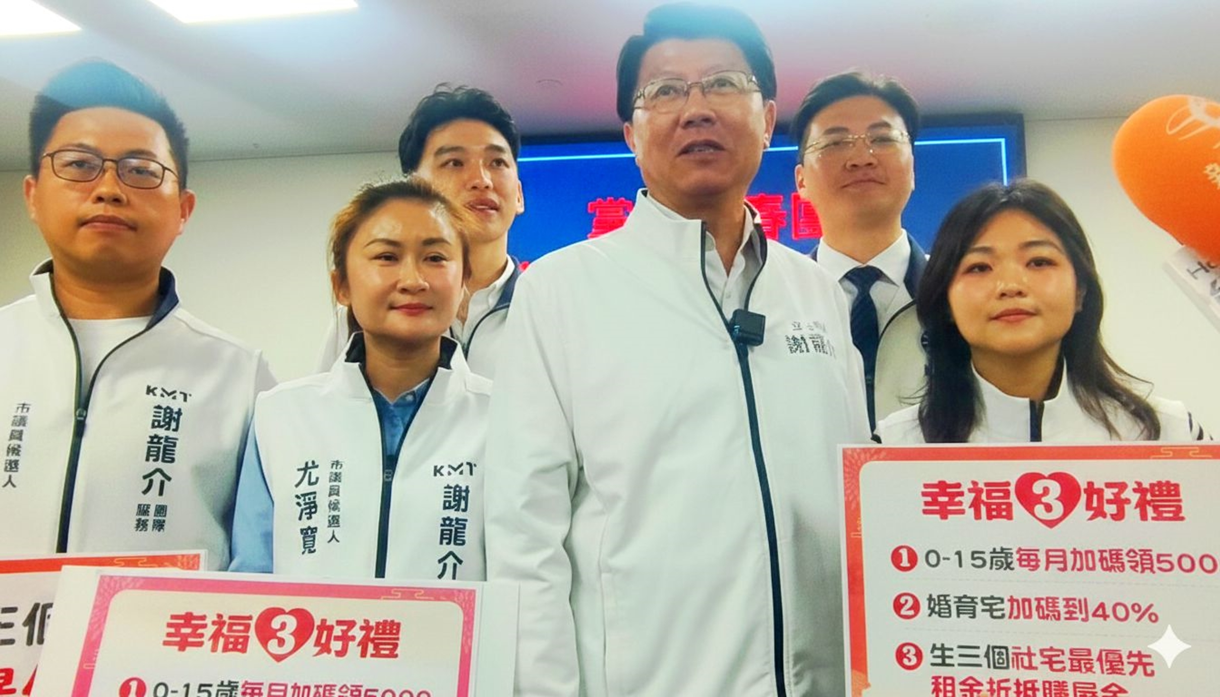 國民黨台南市長參選人、立委謝龍介推出「幸福三好禮」政見,國民黨台南隊全體議員和參選人都跟進。 (記者林雪娟攝)